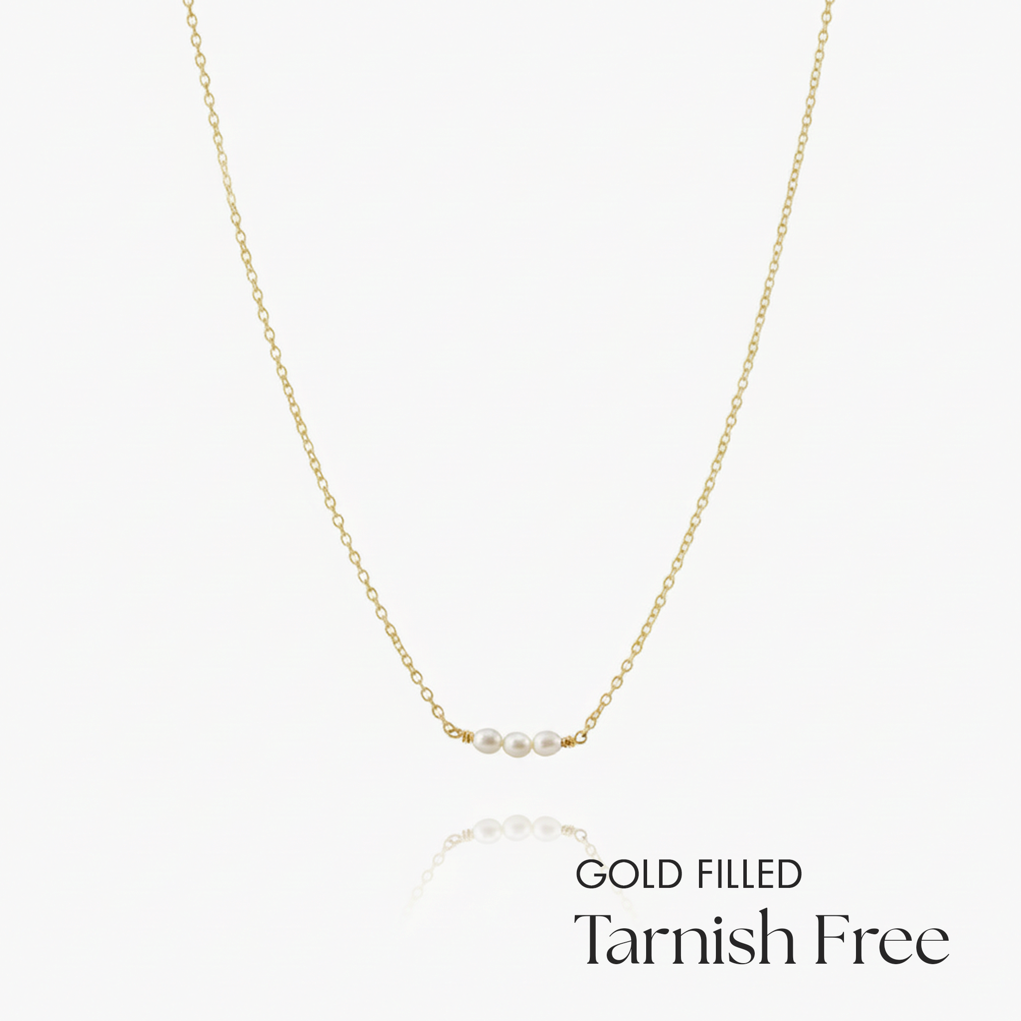 Designed with three tiny seed pearls delicately set at the center, this necklace captures quiet elegance in its purest form. The subtle glow of freshwater pearls pairs effortlessly with a fine gold filled chain, creating a piece that feels light, refined, and timeless.